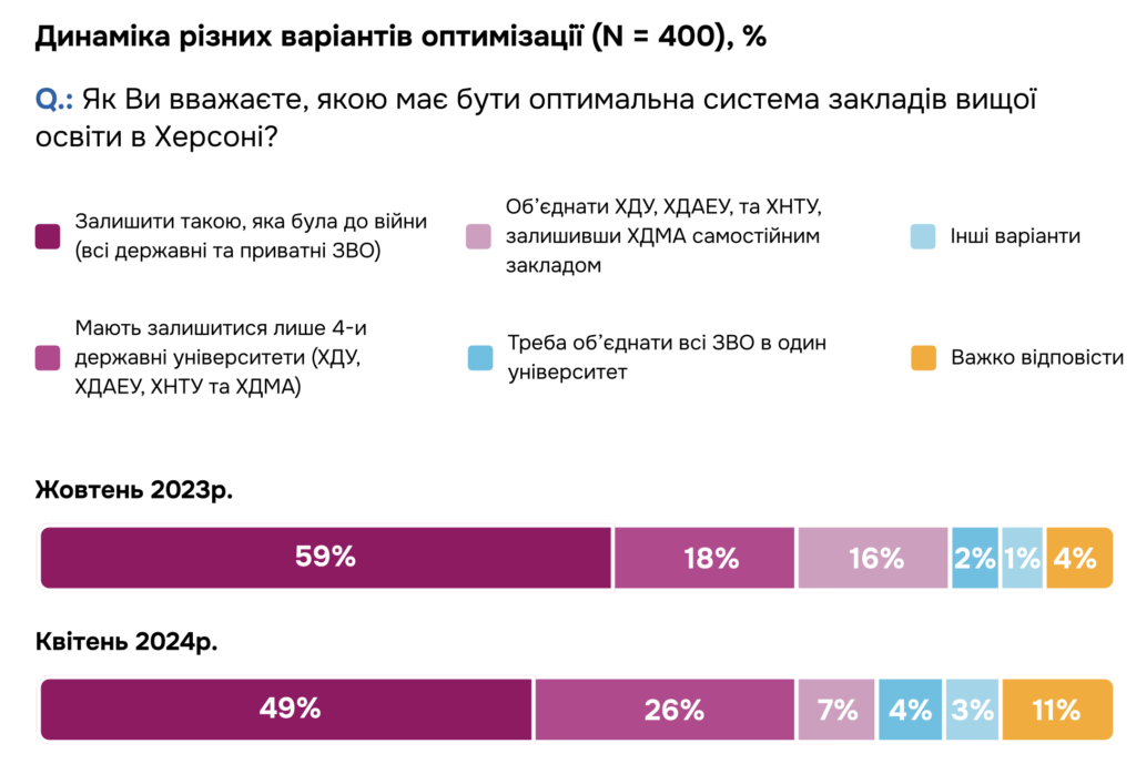 Ідея оптимізації вишів (скорочення кількості закладів) не знаходить популярності серед херсонців. Її підтримують лише 13% опитаних. Хоча частка тих, хто вважає, що система ЗВО в Херсоні має лишитися тією самою, що і до війни, скоротилася з жовтня 2023 по квітень 2024 з 59% до 49%.