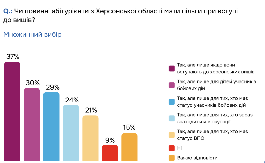 37% респондентів вважають, що абітурієнти з Херсонщини повинні мати пільги при вступі до ЗВО, але якщо вони вступають саме до херсонських вишів. Ще херсонці думають, що діти учасників бойових дій (30%) та самі учасників бойових дій (29%) повинні мати пільги. Це має бути безкоштовне навчання (77%) та вступ до вишу за спрощеною процедурою (54%). Але важливою умовою повинно бути зобов’язання відпрацювати за фахом.