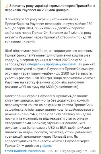 У той же час ПриватБанк вирішив підтримати українців, які користуються сервісами ПриватБанку для переказів Payoneer. У зв'язку з цим банк запустив програму кешбеку, яка діятиме до кінця жовтня 2023 року.