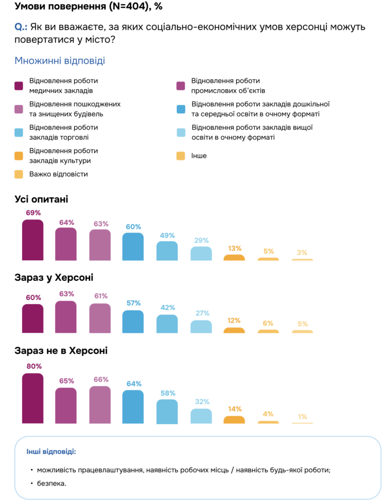 Найбільш важливими соціально-економічними чинниками по вернення для всіх опитаних є відновлення роботи медичних закладів (69%), промислових об’єктів (64%), пошкоджених та знищених будівель (63%), поновлення роботи закладів дошкільної та середньої освіти в очному форматі (60%). Можна констатувати, що для тих, хто зараз не в Херсоні, відновлення різних установ є важливішим, ніж для тих, хто залишився. Найбільшу різницю спостерігаємо щодо відновлення медичних закладів (80% до 60%), відновлення закладів освіти (64% до 57%), та роботи закладів торгівлі (58% до 42%).