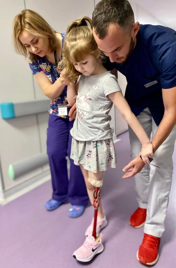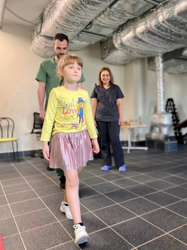 "Лікарям потрібно було допомогти дитині зміцнити м’язи тіла, підготувати ніжку до протезування, навчити тримати координацію на одній нозі та вільно переміщуватися у просторі", — повідомляють в Херсонській ОДА.Марина — перша дитина, яку протезували в Україні. На цьому наполягли батьки, щоб уникнути складних перельотів та мати постійну допомогу реабілітолога та протезиста.