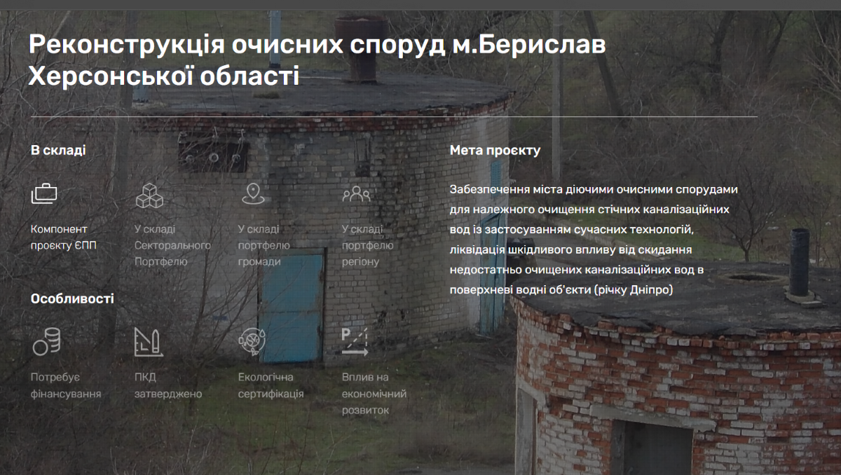 Очисні споруди, розташовані в північно-західній частині Берислава, були збудовані ще у 1972 році та введені в експлуатацію у 1974-му. Згідно з технічним обстеженням, їхній стан класифікується як аварійний. Проблема характерна не лише для Берислава: більшість очисних споруд в Україні були збудовані ще за радянських часів і зараз потребують модернізації.Проєкт передбачає будівництво установок біологічної очистки загальною потужністю 800 кубометрів на добу — чотири автономні блоки по 200 кубометрів. Споруди будуть повністю автоматизовані, енергоефективні та зможуть функціонувати незалежно від рельєфу місцевості чи рівня ґрунтових вод.