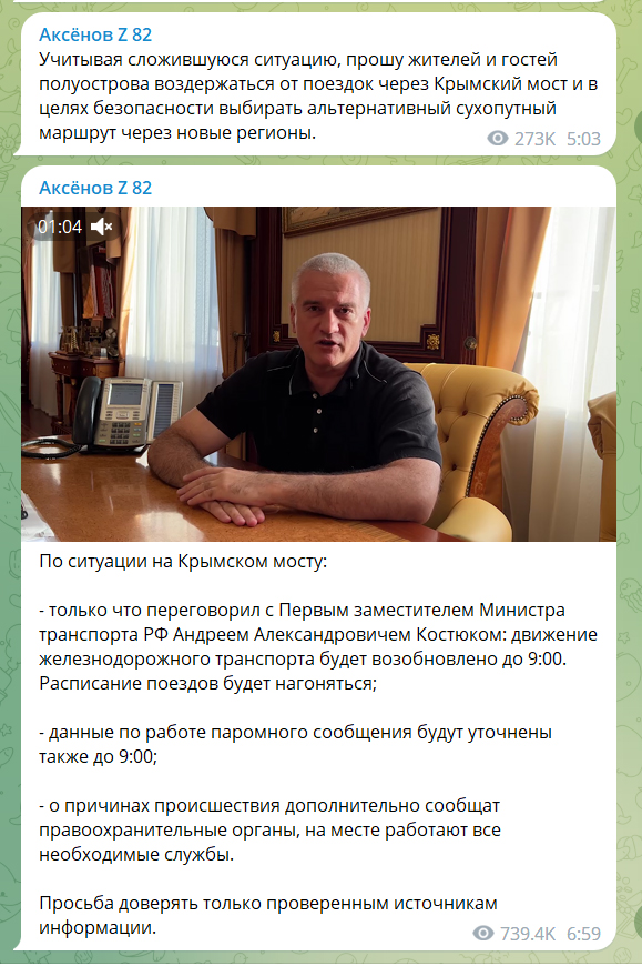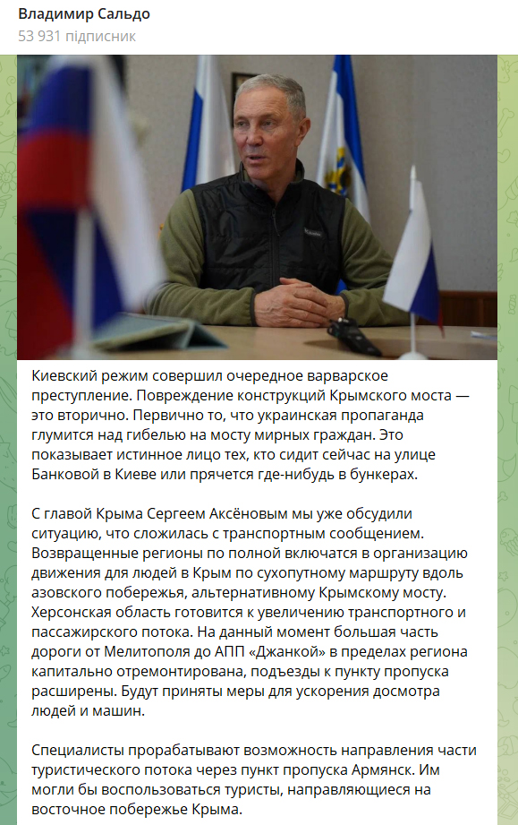 «Усіх мешканців і гостей Криму просимо користуватися сухопутним коридором через нові регіони Російської Федерації (окуповані українські території, – Ред.)», – сказав Сергій Аксьонов, коментуючи наслідки удару по Керченському мосту: морські дрони вразили 145-ту опору Кримського мосту, яка знаходиться на острові Тузла.Тобто підконтрольний росіянам кримський «гауляйтер» рекомендує кримчанам і мешканцям РФ користуватися шляхом, який проходить по території, яка перебуває під вогневим контролем ЗСУ, де було завдано вже кілька ракетних ударів по окупантських місцях базування і складах боєприпасів: на Арабатській стрілці, в селищах Рикове і Новоолексіївка. Також було завдано удар по Чонгарському мосту.