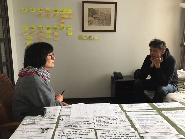 Потім ми дали сценарію полежати. У 2020-му році, під час локдауну, ми його перечитали, обговорили. І я знову опинилася сама у готельчику «Княжа Гора» біля Тарасової гори, працювала ще два-три тижні. Потім приїхали Роман із Дар’єю Аверченко, і ми обговорювали те, що я напрацювала, задавали одне одному тисячу питань: наскільки це логічно? наскільки це доречно? наскільки це правдиво? Реальність, яку ми описували, виглядала абсурдистською, але це була наша реальність, справжня, ми в ній жили багато років.