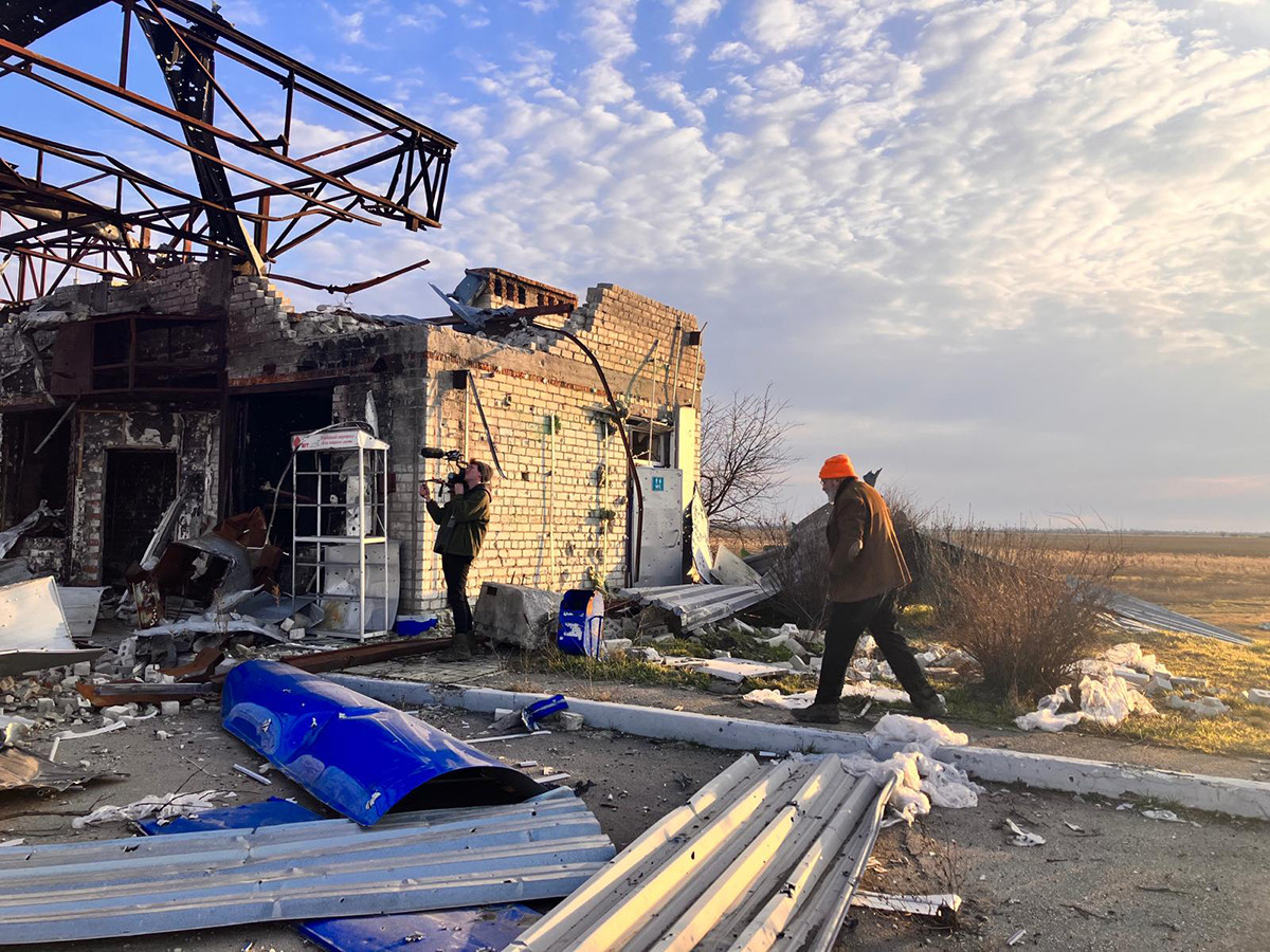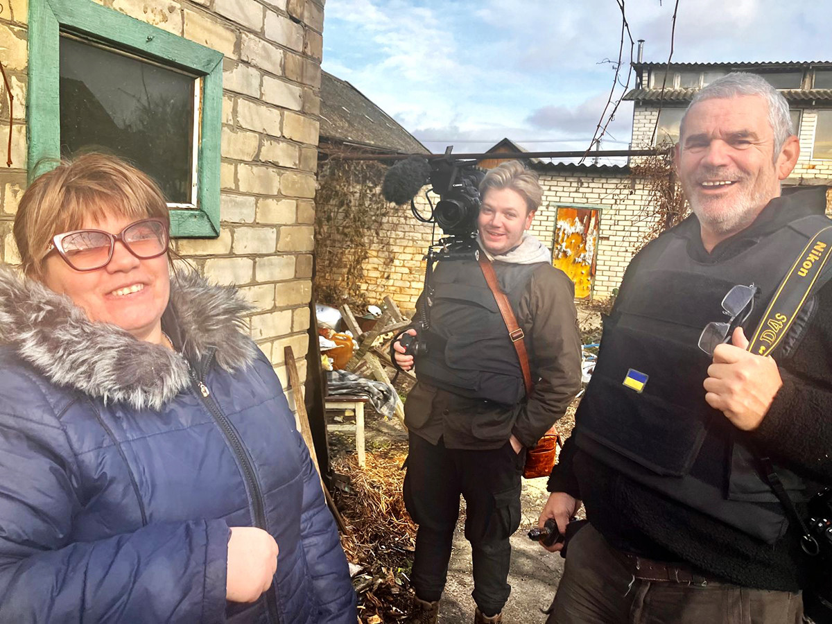 Кейлін Робертсон і Джон Суїні знімають поблизу Херсона («Під смертоносним небом»), 2023