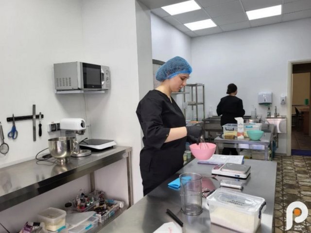Окрім власниці пані Аліни, на кухні трудяться ще дві кондитерки – Інна та Марина. Обидві майстерно змішують інгредієнти для нової порції макарон.
