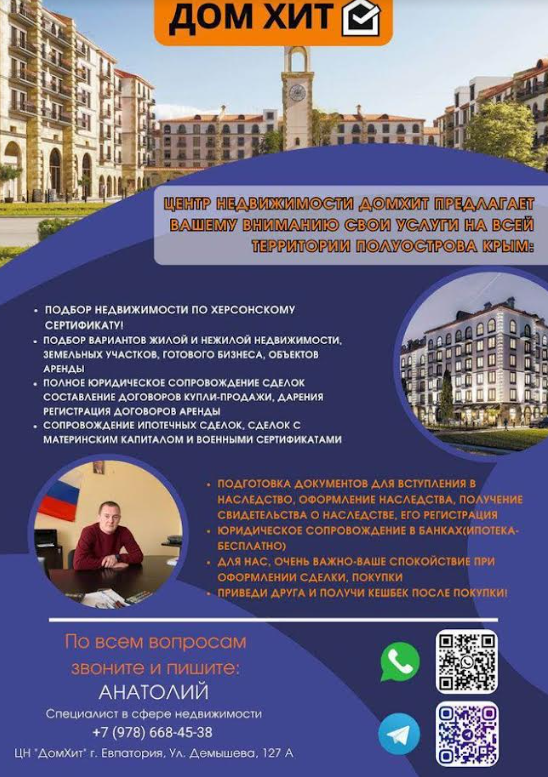 Днями в групі з продажу і оренди житла в тимчасово окупованій Євпаторії з’явилось оголошення колишнього гауляйтера села Коробки Каховської громади Анатолія Акименка. Він називає себе спеціалістом у сфері нерухомості євпаторійського ООО «ДомХит» і пропонує свої послуги «по всій території півострова Крим». Він обіцяє юридичний супровід, спокій при оформленні договорів і бонуси клієнтам.