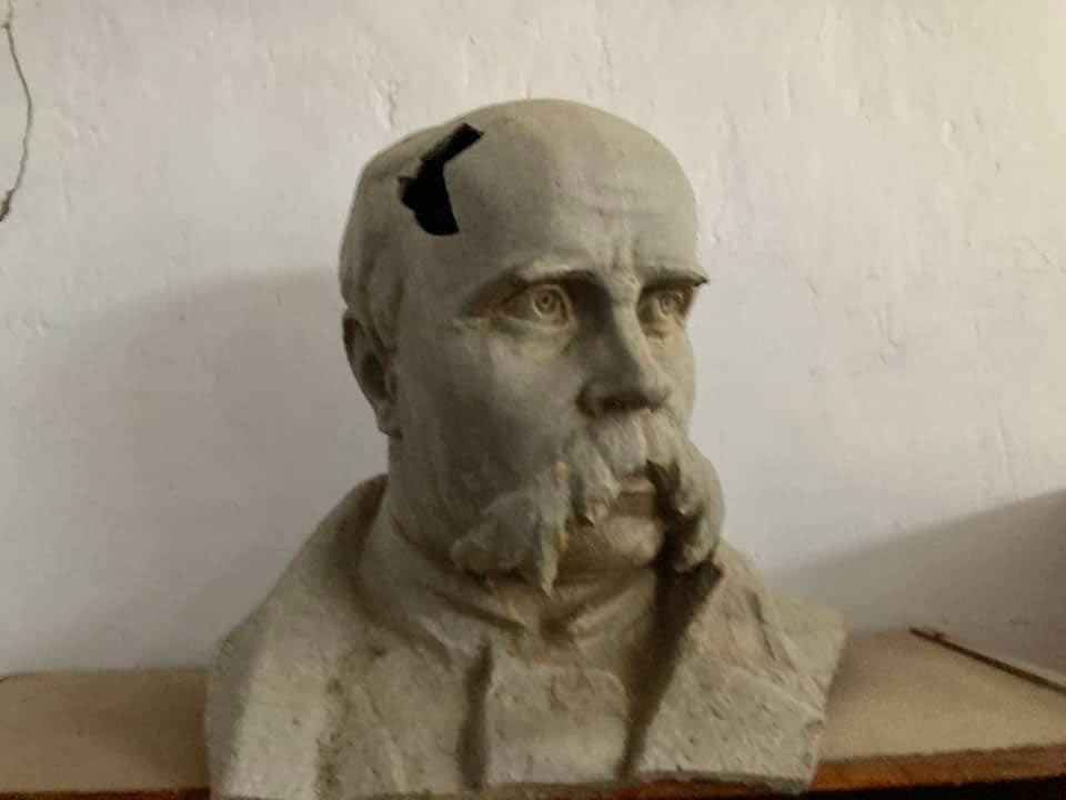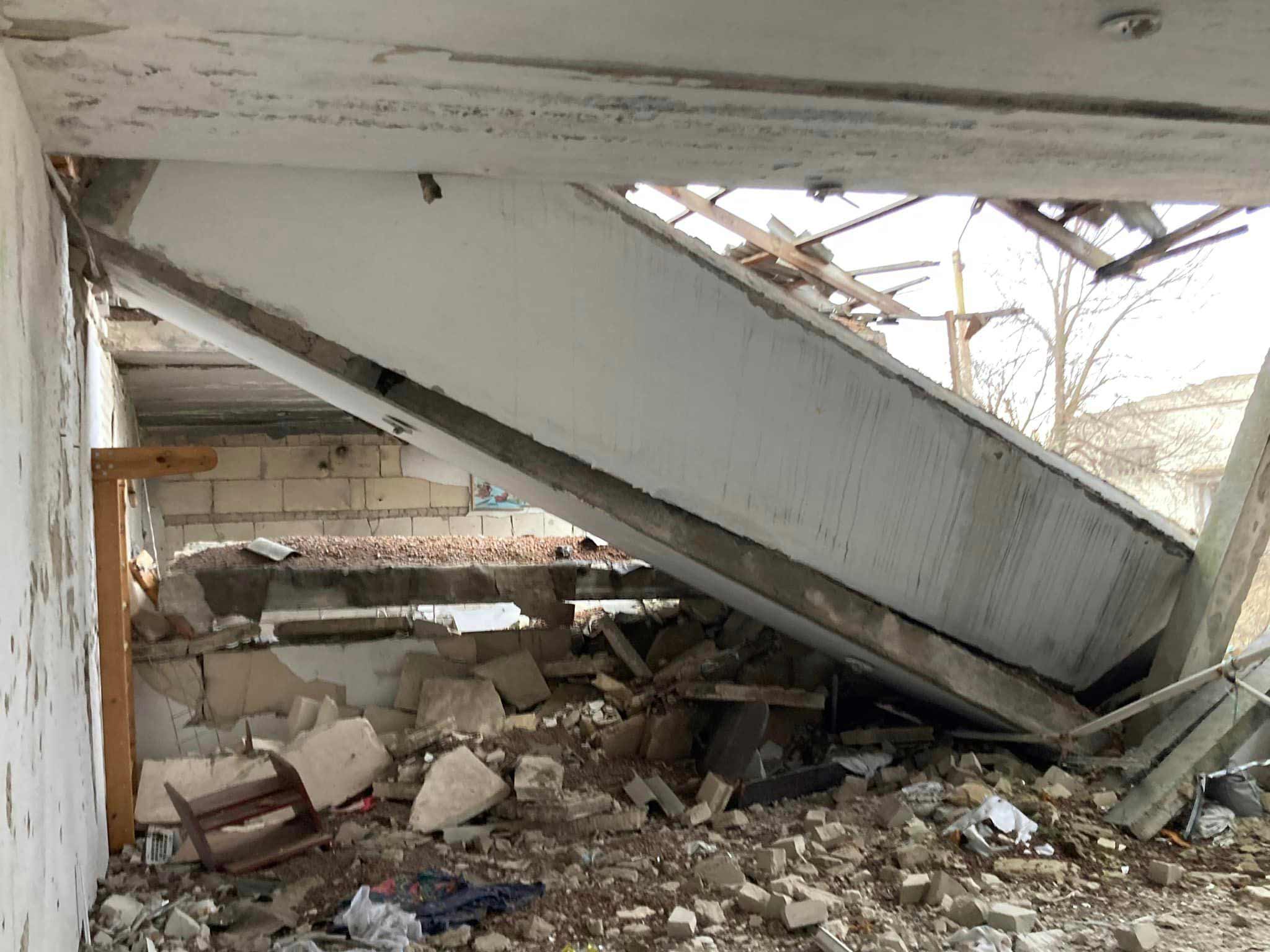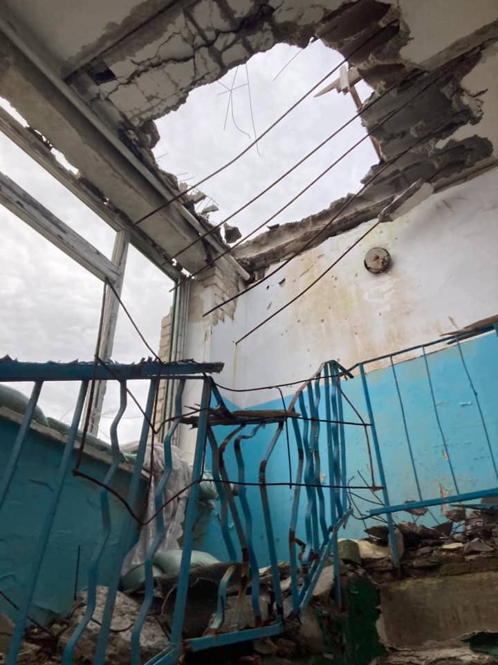 Він пише, що в кожний корпус окупаційні війська поцілили авіабомбами.На фото видно, що немає вцілілих вікон. І зруйнована одна з кімнат у навчальному закладі.