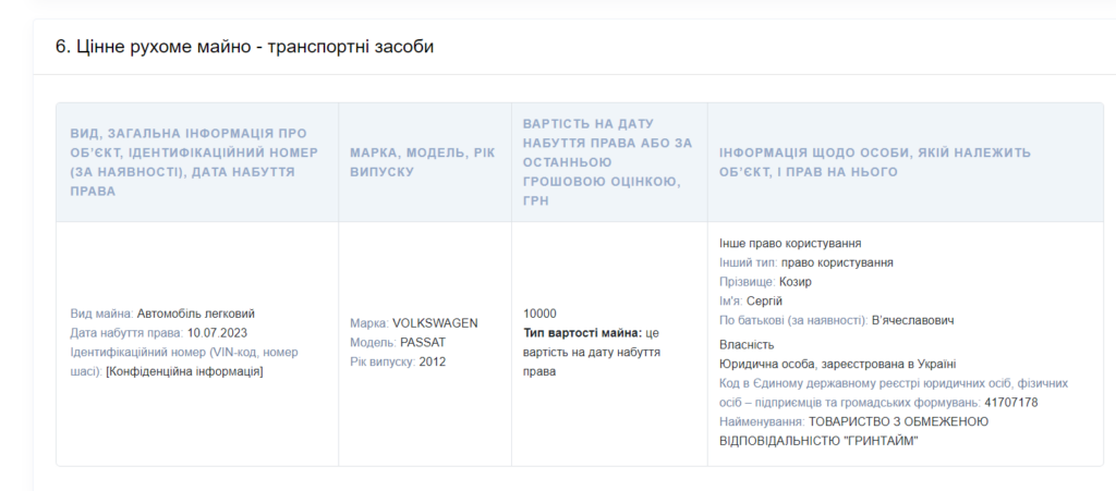 Але це не найцікавіше у декларації Козиря. Він користується авто VOLKSWAGEN PASSAT 2012 року випуску із зазначеною вартістю на момент набуття права користування 10 тисяч гривень. Авто належить ТОВ «Гринтайм» з Миколаєва, яка у 2018 році фігурувала у розслідуванні «Нікцентру» про завищення цін на плитку в Миколаєві та відсутність відповідної техніки для здійснення робіт.