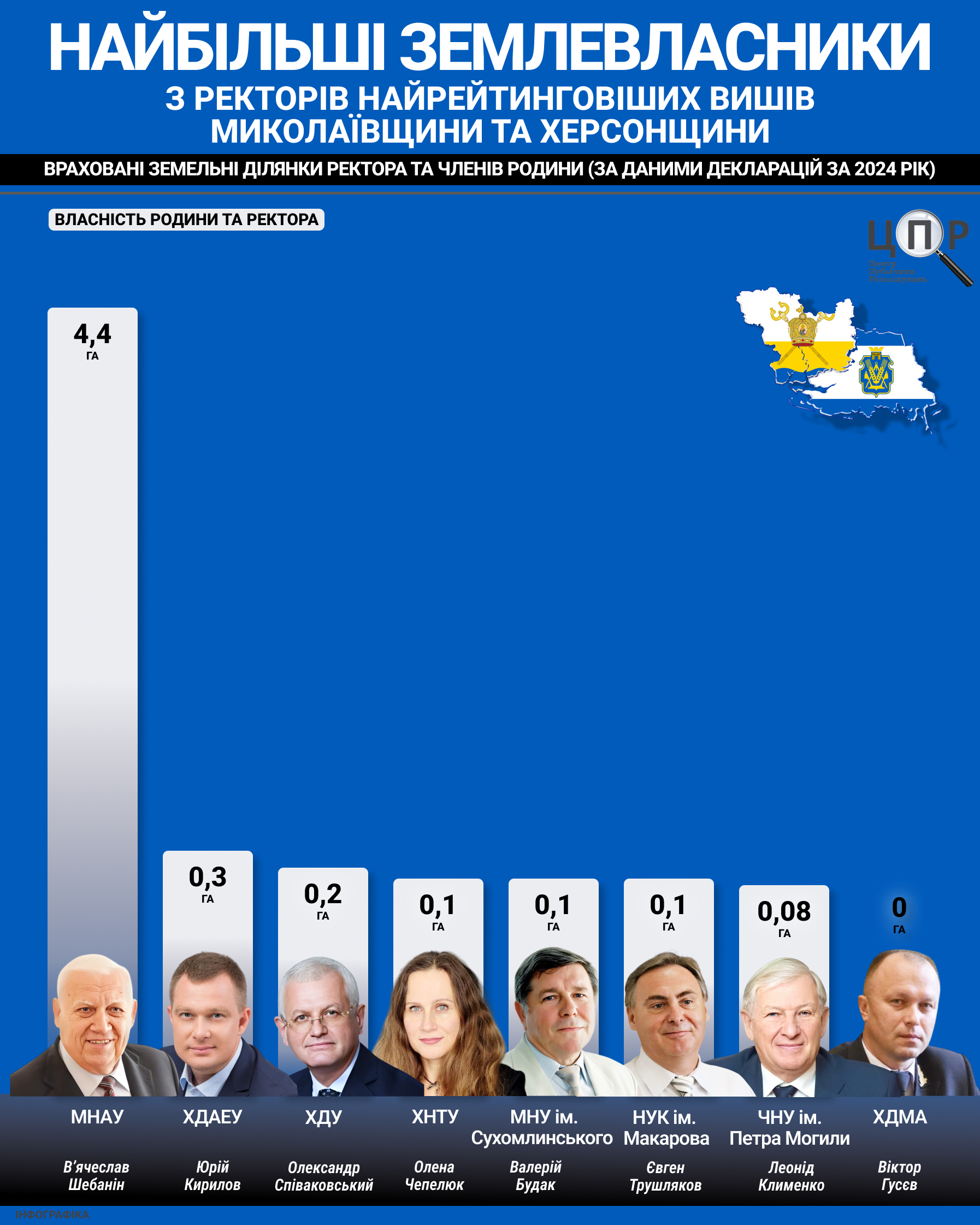 Лідер за площею землі серед миколаївських ректорів рейтингу ЦПР – ректор ЧНУ В’ячеслав Шебанін: загалом 4,4 гектара. У нього – ділянка на 2 гектари у Першотравневому, ще дві у Золотоноші та Миколаєві: 922 квадратного метра та 1000 квадратного метра відповідно. Його дружина володіє чотирма ділянками: ще 2 гектари в Першотравневому, 700 квадратного метра у Чорноморці, 1000 квадратного метра у Покровці (Очаківський район) і 407 квадратного метра у Кир’яківці. Порівняно з 2023 роком нічого не змінилось.0,3 гектара землі має подружжя очільника ХДАЕУ Юрія Кирилова. Сам ректор володіє ділянкою площею 1515 квадратних метрів у селі Олешківської громади. Його дружина Оксана Нікітіна має ще дві – 1000 квадратів у Генічеській громаді та 921 квадрат у Чорнобаївці. Хоча ці ділянки вона придбала ще у 2020 році, у декларації за 2023 рік їх не було.