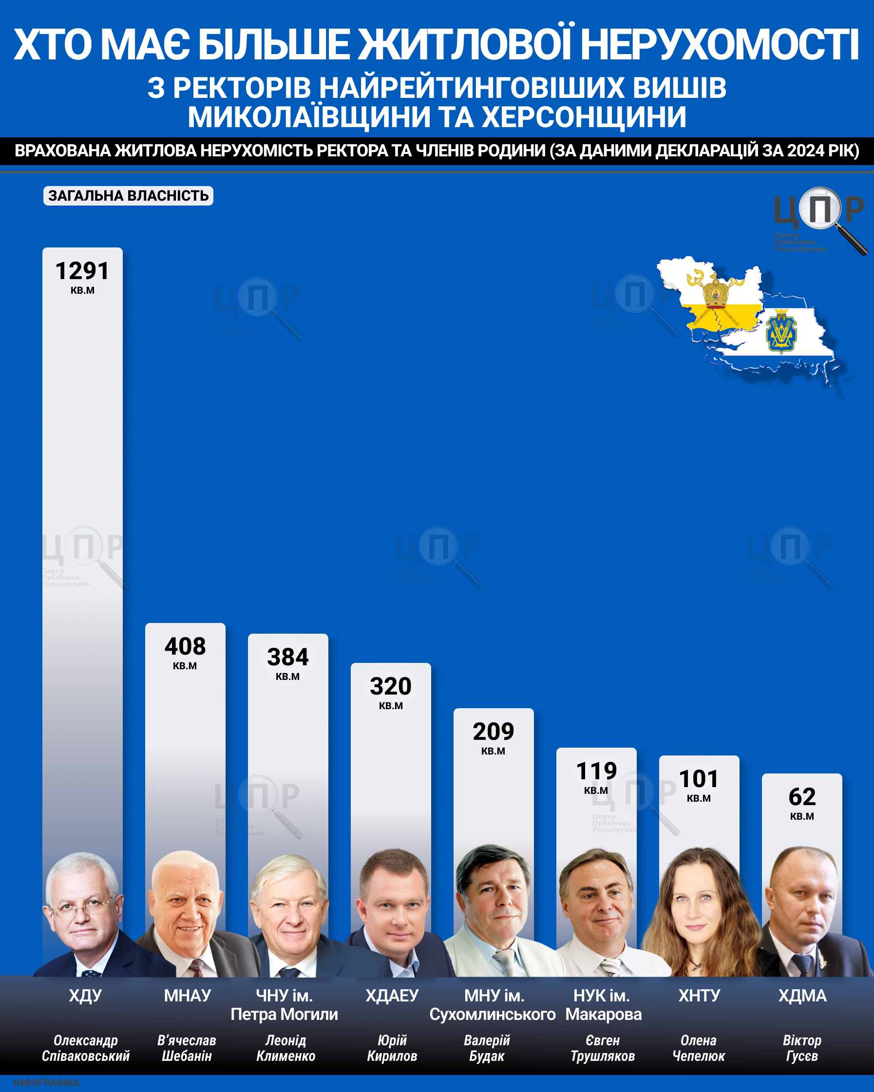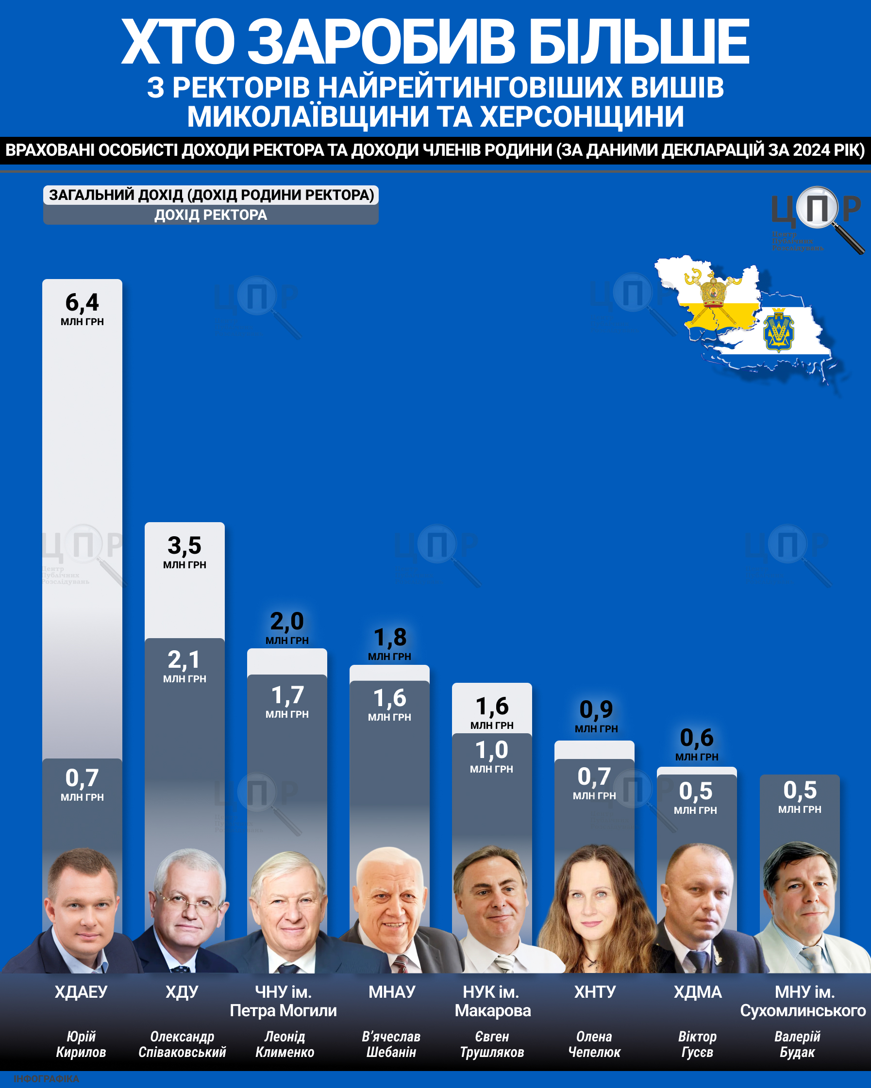 Ректори вищих навчальних закладів Херсонської та Миколаївської областей у своїх фінансових звітах задекларували мільйонні доходи та заощадження, у когось з’явилося нове авто, а хтось залишився на рівні минулих років.Центр публічних розслідувань проаналізував, як змінилися доходи та активи очільників вишів за 2024 рік. Для аналізу ЦПР обрав декларації ректорів вишів, які зайняли вищі позиції в рейтингу Освіта.ua. Тож дослідження охопило фінансові звіти керівників Чорноморського національного університету імені Петра Могили, Миколаївського національного аграрного університету, Національного університету кораблебудування імені адмірала Макарова, Миколаївського національного університету імені В.О. Сухомлинського, Херсонської державної морської академії, Херсонського державного аграрно-економічного університету, Херсонського державного університету та Херсонського національного технічного університету.