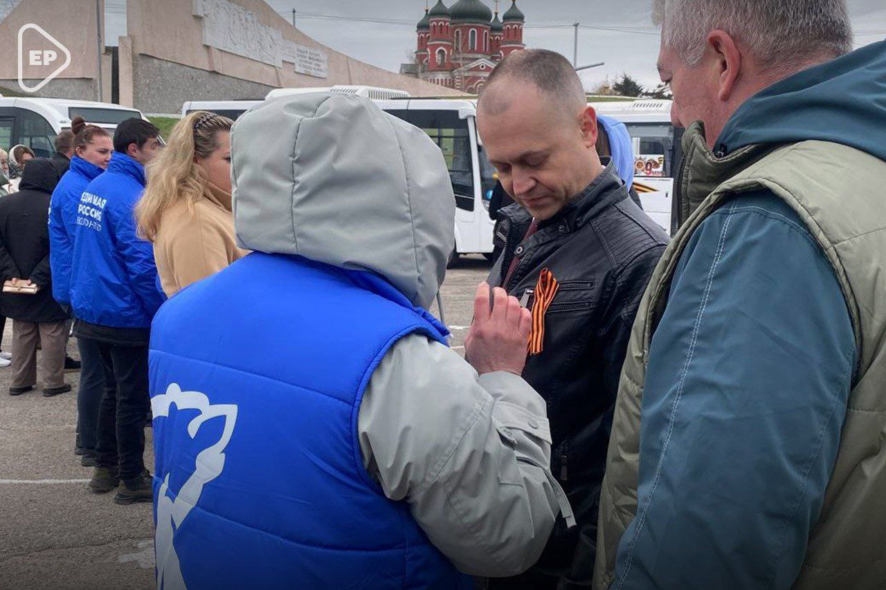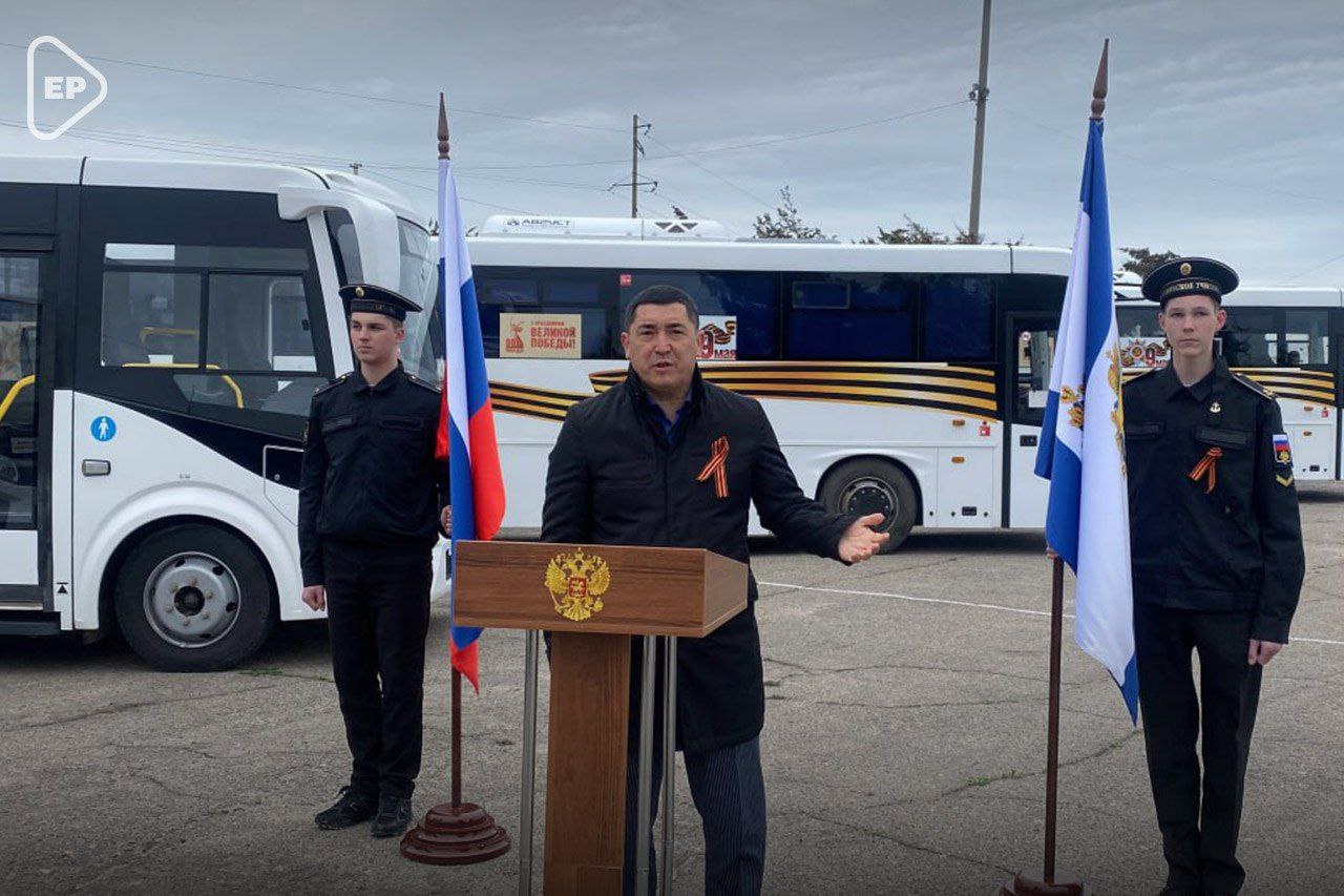 З вітальними словами на фоні «побєдобусів» виступили заступник голови окупаційної обласної думи Павєл Тропкін, депутат цього фейкового органу Енвер Абдураімов і директор окупаційної філії «Промсвязьбанка» Алєксєй Грішин. Після того учні окупаційного Генічеського коледжу сфери обслуговування роздали присутнім георгіївські стрічки – відмінний знак власівців, які у Другій світовій воювали на боці Гітлера.