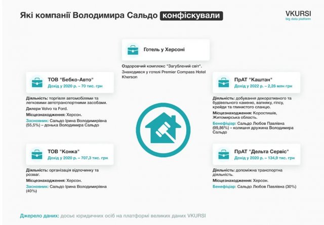 Колаборант Володимир Сальдо володів великою кількістю активів. Їх географія виходить далеко за межі Херсонщини. Усе майно посіпаки окупантів стягнули на користь держави.Усі активи зрадника Сальдо конфіскували на користь держави наприкінці серпня. До Фонду державного майна передали земельні ділянки, багато нерухомості, два автосалони, автомобіль та гранітний кар'єр на Житомирщині.