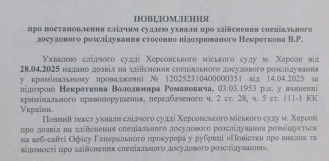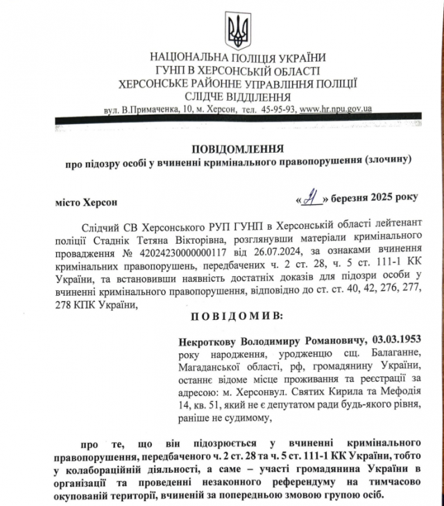 У документі українських правоохоронців йдеться про те, що Володимира Некроткова, жителя Херсона 1953 року народження, підозрюють у сприянні проведенню незаконного «референдуму» на тимчасово окупованій території Херсонської області у вересні 2022 року.