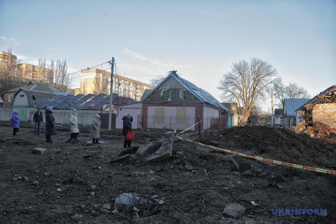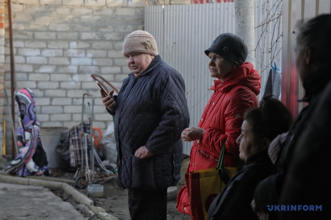 Поки спілкуємося з місцевими, хлопці розвантажили пакунки та покликали нас, аби їхати до іншого пункту роздачі. Тож прощаємося з нашими новими знайомими й рушаємо далі. На іншій локації на нас також чекає делегація з місцевих жительок. Жінки радіють, що ми приїхали. Перебиваючи одна одну, починають розповідати про свої біди. Так, днями в їхній мікрорайон «прилетіло». Зруйновано кілька приватних будинків, у багатоповерхівках повилітали вікна з першого по дев’ятий поверхи. Місцеві хочуть показати нам вирву, ми йдемо за ними, наче по скляному килиму – прибрати наслідки обстрілу комунальники та жителі ще не встигли.