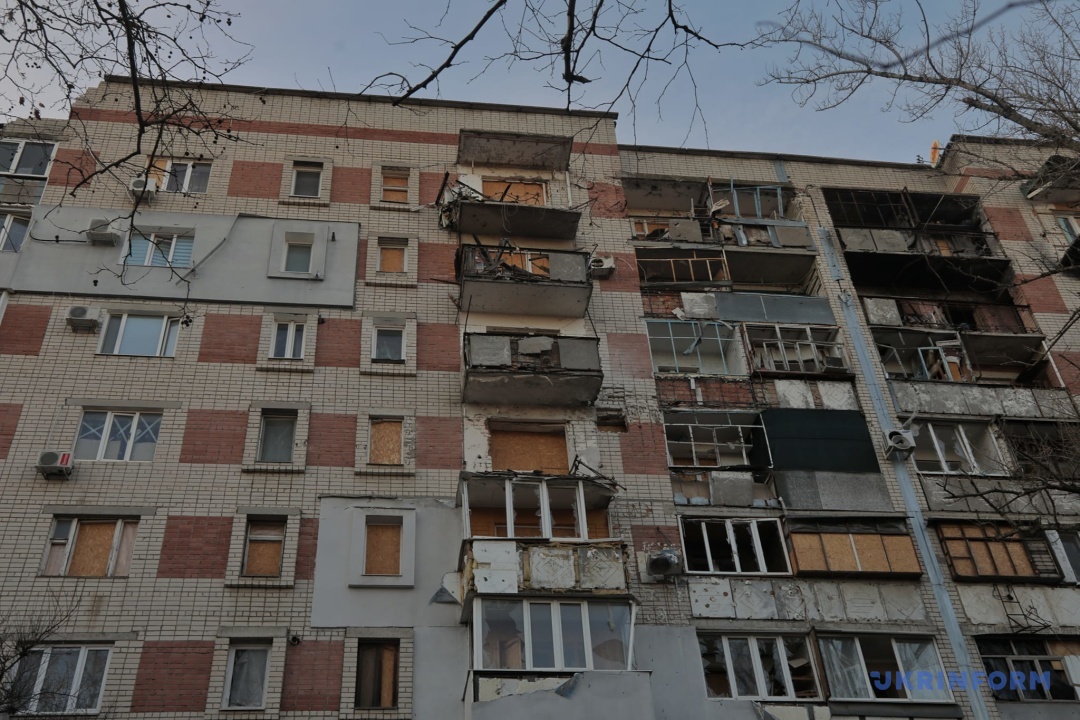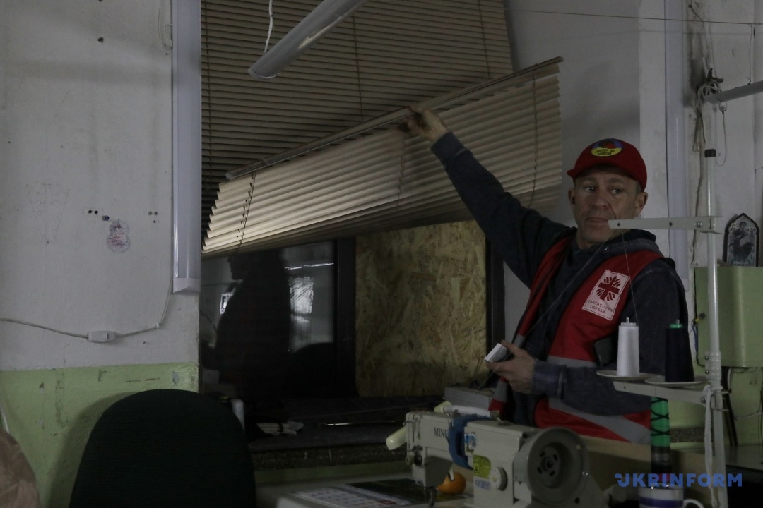 Їдемо до одного з мікрорайонів, щоб видати людям із вразливих груп продуктові набори та засоби гігієни. На годиннику – близько другої дня, світить сонце та «майже весна», подекуди на вулицях можна побачити людей. Чи не у кожному кварталі працюють комунальники: щось лагодять, прибирають скло, відтягують побиті віконні рами. Одразу відчувається контраст між оманливим відчуттям спокою, яке дарує гарна погода, та реальною ситуацією в Херсоні.