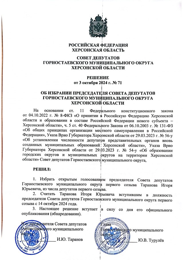 З 18 вересня 2024 року виконання обов’язків голови незаконної ради депутатів у селищі Горностаївка Каховського району Херсонщини окупанти поклали на так званого депутата від путінської «Единой России» Іґоря Таранова. Пізніше російські загарбники прийняли рішення про призначення Таранова на цю посаду з 14 жовтня 2024 року.