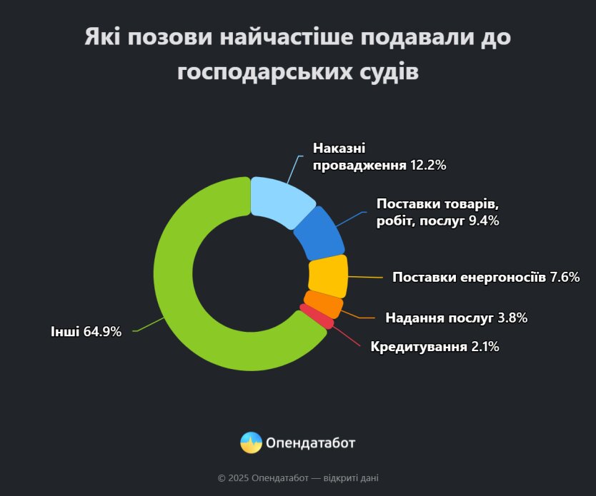 У господарських судах переважали справи наказного провадження — 7,3 тисячі (12%), справи щодо поставки товарів, робіт та послуг становили 9,4%, а справи щодо поставок енергоносіїв — 7,6%.