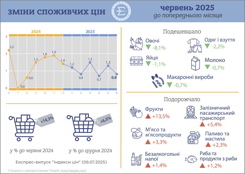 Основним фактором зростання цін у червні стали продукти харчування та безалкогольні напої, які загалом подорожчали на 1,4%. Найбільший стрибок зафіксовано у вартості фруктів — їхні ціни зросли на 13,5%. Також споживачі відчули подорожчання м'яса та м'ясопродуктів, безалкогольних напоїв, риби, сала, хліба, кисломолочної продукції, масла та цукру в діапазоні від 0,2% до 3,3%.