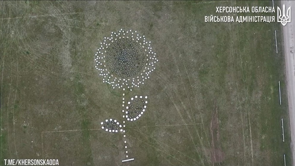 А з нагоди Міжнародного жіночого дня ХОВА презентувала величезний соняшник. Особлива квітка вийшла висотою 33 метри, шириною 16 метрів, а для її створення була використана нова партія допомоги військовим – 411 безпілотників.
