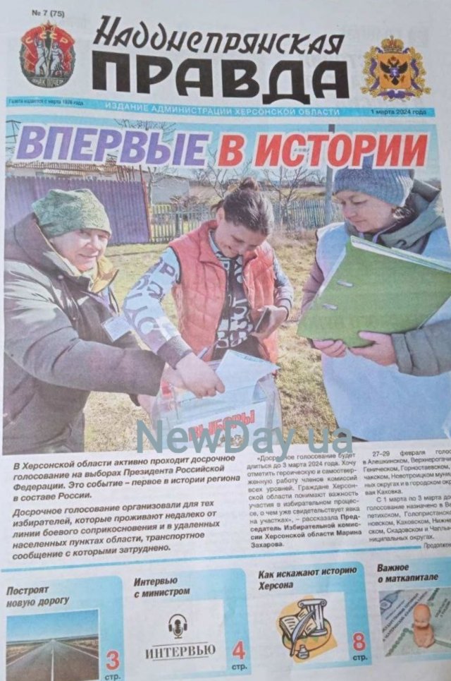 Найактуальнішій для окупантів темі «виборів» путіна присвячений № 7 агітки «Надднепрянская правда». У номері також можна прочитати програму передач окупаційного телеканалу «Таврия», інтерв’ю на цілу сторінку окупаційної міністерки праці і соціального захисту алли бархатнової з заклинанням у кожному абзаці «Росія - соціальна держава», «роздуми» майбутнього в’язня Гааги (якщо доживе) сальда про те, що «Зеленського треба судити». На цілу шпальту поміщено страшну казку з назвою «Як у Херсона намагаються вкрасти його російську історію».