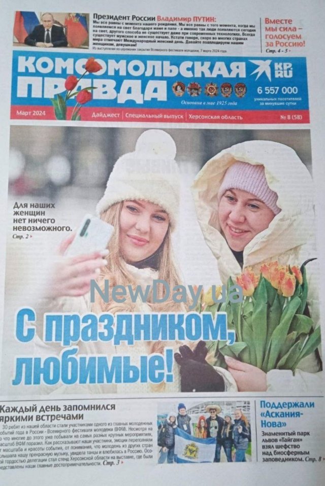 Папір, кажуть, все стерпить. У цьому випадку паперу, на якому друкуються окупаційні агітки «Комсомольская правда. Херсонская область» і «Надднепрянская правда», не позаздриш. Терпіти йому доводиться таку нахабну брехню - що просто жах!У № 6 окупаційної «НП» вже на першій шпальті можна прочитати про те, що росія «продовжить звільнення своїх земель від київської хунти, а всі території, які до цих пір страждають під гнітом бандерівської влади, скоро зможуть зітхнути на повні груди». У № 8 окупаційної «КП» на першій шпальті, як завжди поміщено, «мудрість» путіна. Цього разу не про «гумову попу», а про те, що «завжди існує чоловіче і жіноче начало».