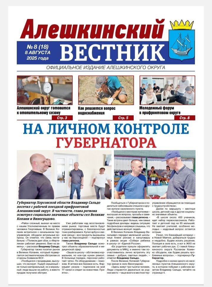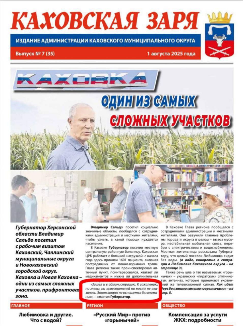 Коли читаєш окупаційну агітку «Алешкинский вестник», складається враження, що всі снаряди українського війська витрачаються на окуповані Олешки і села навколо. У черговому номері «газети» про «обстріли з боку укронацистів» написано буквально на кожній сторінці. «Губернатор також відвідав ринок у Великих Копанях, який піддається систематичним обстрілам з боку ЗСУ». «З початку року ворог знищив майже 20 машин швидкої допомоги, неодноразово бив по Альошкінській лікарні». «Територія парку «Альошкінські піски» піддавалась цілеспрямованим атакам – бойовики ЗСУ обстрілювали ліс запальними снарядами, провокуючи нові осередки загоряння». «Нацисти влаштовують атаки і вдень, і вночі. Пускають дрони на наднизьких висотах, пробивають оборону, хитрують». Зрозуміло, що такі обстріли вигідні насамперед окупантам, бо дають їм змогу без зайвих пояснень продовжувати війну. Мовляв, стріляємо у відповідь. Провокації – давня зброя путінського режиму. І пропаганда цьому дуже допомагає. А якщо читач раптом засумнівається в «обстрілах ЗСУ», для нього пропагандисти разом з окупаційним головою «округу» Русланом Хоменком підібрали висловлювання у дусі Соловьйова: «Зеленський підтерся гуманітарним правом, він воює з беззбройними медиками, з цивільними, з мирними людьми, з дітьми, стариками і інвалідами. Це прояв справжнього фашизму з боку держави 404». Так само багато огидної брехні і у черговому номері окупаційної агітки «Каховская заря», але є і «нововведення» – чорна пляма на першій шпальті. Там пропагандисти розмістили статтю про поїздку «губернатора» Володимира Сальдо у Каховський «округ». Але «голова» Павло Філіпчук вирішив, що слова «губернатора»: «Зайшов і в адміністрацію. На жаль, ні голови, ні заступників на місці не виявилось. Це питання не залишиться без уваги» ганьблять його репутацію, тому наказав підлеглим… замалювати у «газетах їх чорним маркером! На першій шпальті окупаційної агітки «Черноморец» є слова, які читач сам захоче замалювати. «Газета Скадовського муніципального округу, – написано там. – Видається з 30 листопада 1930 року». Але ж це нахабна брехня! Газета, яка вперше побачила тоді світ, називалась «Чорноморець» і ні до «муніципального округу», ні до держави-агресора Росії не мала жодного відношення.