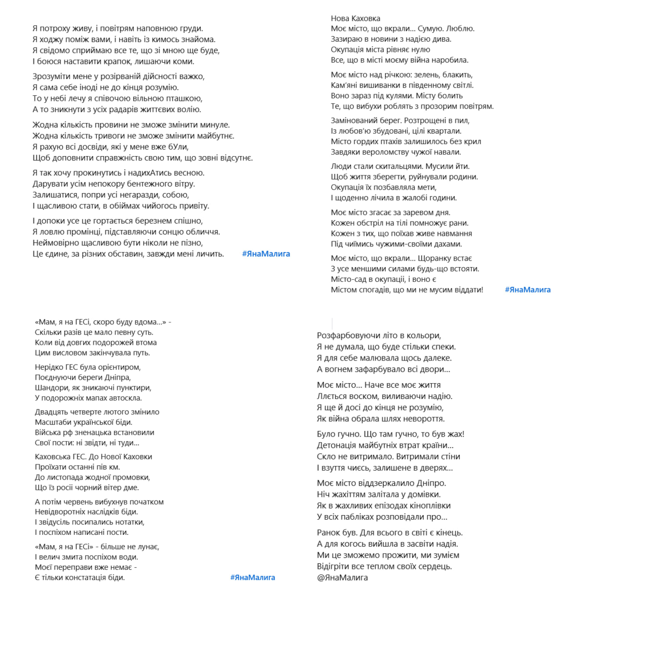 Водночас із тим Яна Малига не полишила творчість. В січні 2025 року в Києві та інших областях України була презентована її поетична збірка "Малюй собі мрії". Сюди увійшли вірші, які були написані вдома у Новій Каховці до 24 лютого 2022 року та декілька творів за воєнний період, але ті, які є більш автобіографічними. Таким чином в семи розділах книги знайшлося місця як суворим правдивим рядкам про окупацію та війну, так і ліричній поезії, яка має на меті закохати в хвилі Дніпра, степовий вітер та іншу природну красу півдня.Фото надала співрозмовниця: Презентація поетичної збірки "Малюй собі мрії"