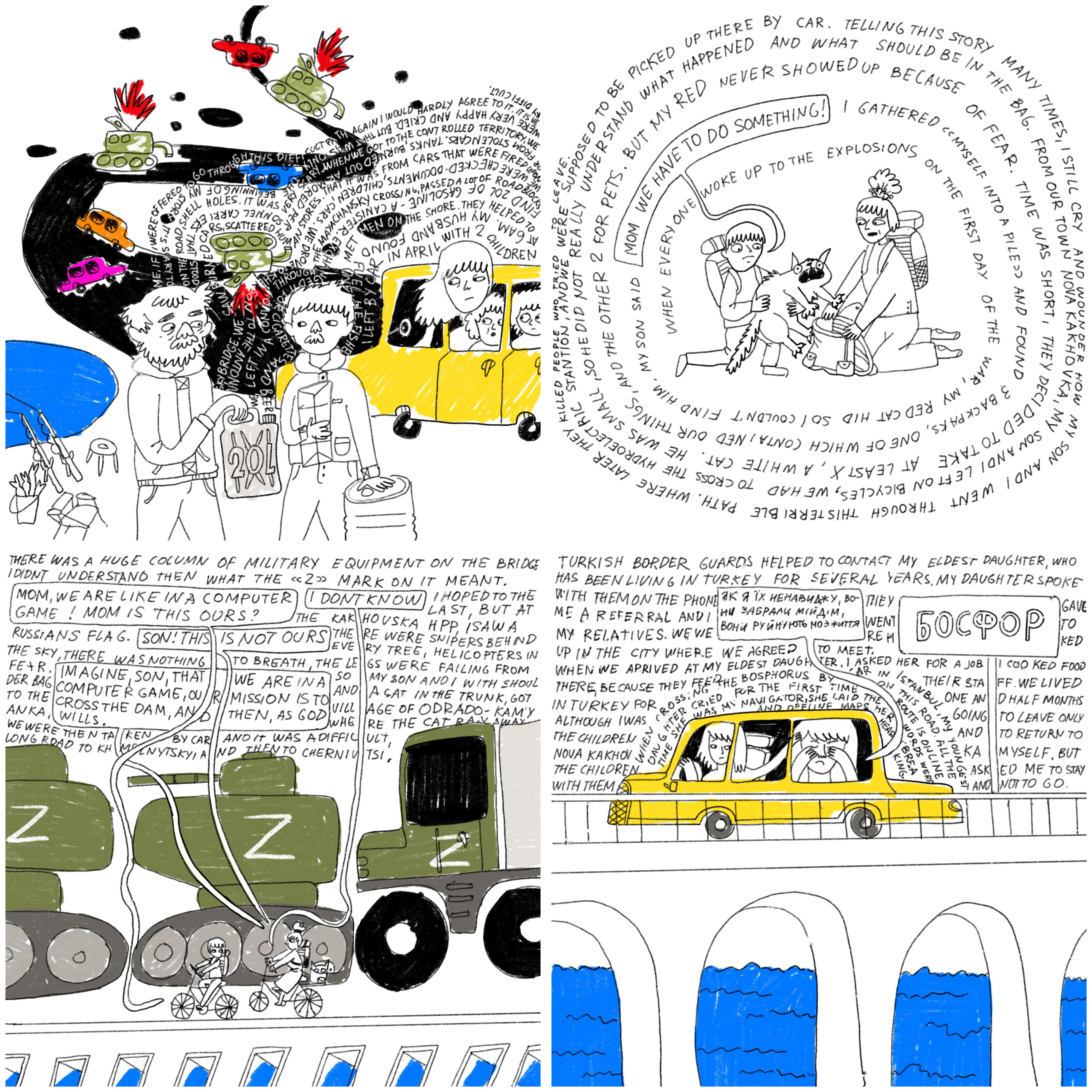Серед інших – розповідь людей-односельців, які півтора місяця просиділи у підвалі. Російські військові забороняли жінкам та дітям виходити, натомість чоловіків експлуатували. За нагоди в один із днів вони всі разом, не вагаючись, зібрали речі та на велосипедах подолали 20 кілометрів вздовж лісопосадок до українських блок-постів. Ще одна історія належить бабусі з села Любимівка Каховського району. Жінка все життя пропрацювала бухгалтером, а коли її діти поїхали на заробітки за кордон – доглядала за онучками. Цей довгий та складний шлях вона додала, щоб вивезти дівчат до батьків.