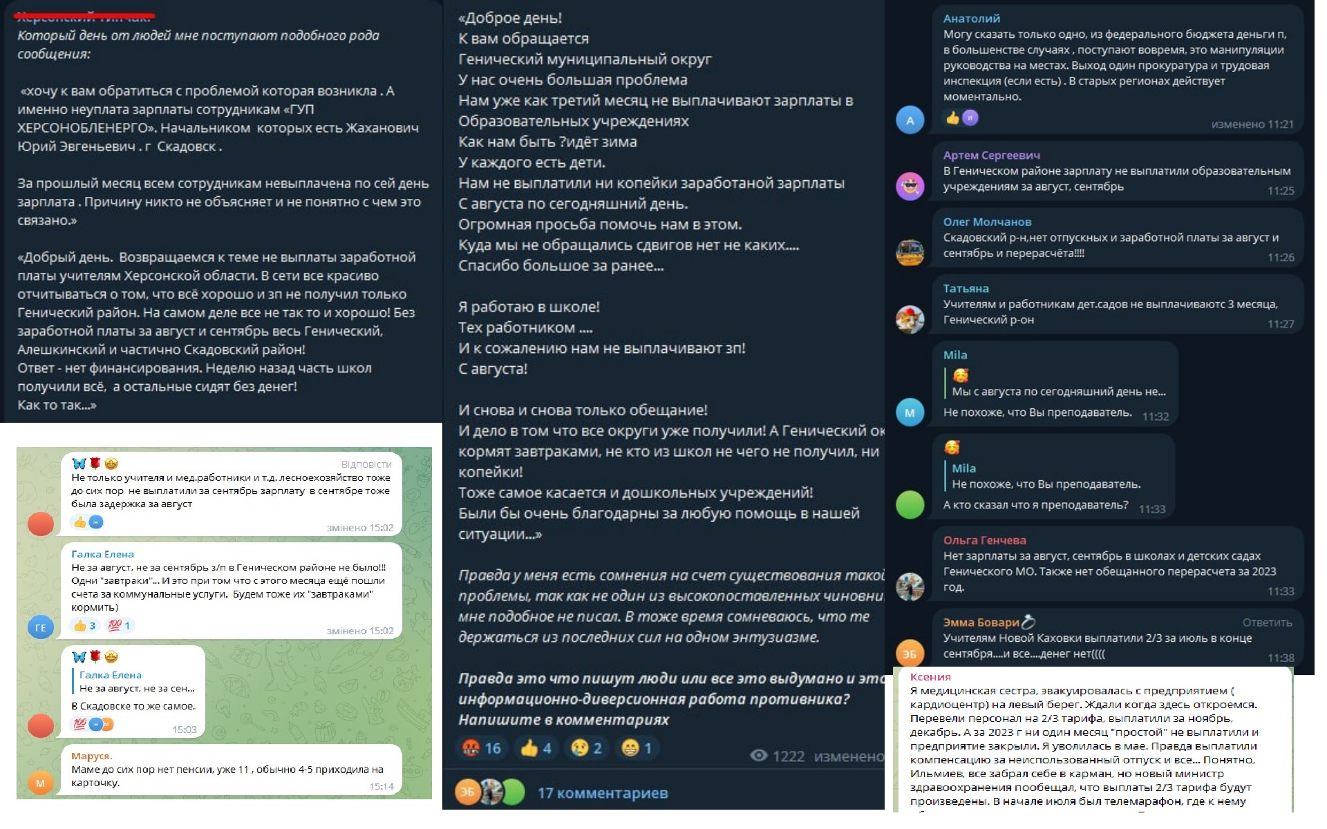 Скарги оприлюднив один із російських пропагандистських Telegram-каналів. Як пишуть жителі окупованих територій в коментарях, кілька місяців без обіцяних зарплат сидять працівники шкіл, дитячих садків, так званого "Херсонобленерго" та інших "державних підприємств", які були створені окупаційними органами влади. Більше того, працівників установ, яких "евакуювали" з правого берега Херсонщини під час втечі на лівобережжя, просто звільнили та залишили без роботи, попри заяви щодо збереження робочих місць.