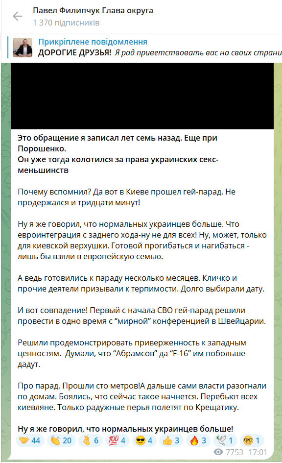 – Ось у Києві пройшов гей-парад. Не протримався й тридцяти хвилин! Ну, я ж казав, що нормальних українців більше. Що євроінтеграція із заднього ходу – ну не для всіх! Ну, може тільки для київської верхівки. Готовий прогинатися та нагинатися – лише б взяли до європейської родини… І ось збіг! Перший з початку СВО гей-парад вирішили провести одночасно із “мирною” конференцією у Швейцарії. Вирішили продемонструвати прихильність до західних цінностей. Думали, що “Абрамсов” та “F-16” їм більше дадуть. Про парад. Пройшли сто метрів! А далі сама влада розігнала по домівках. Боялися, що зараз таке розпочнеться. Переб’ють усіх кияни. Тільки райдужне пір’я полетить Хрещатиком, – йдеться в дописі Філіпчука.