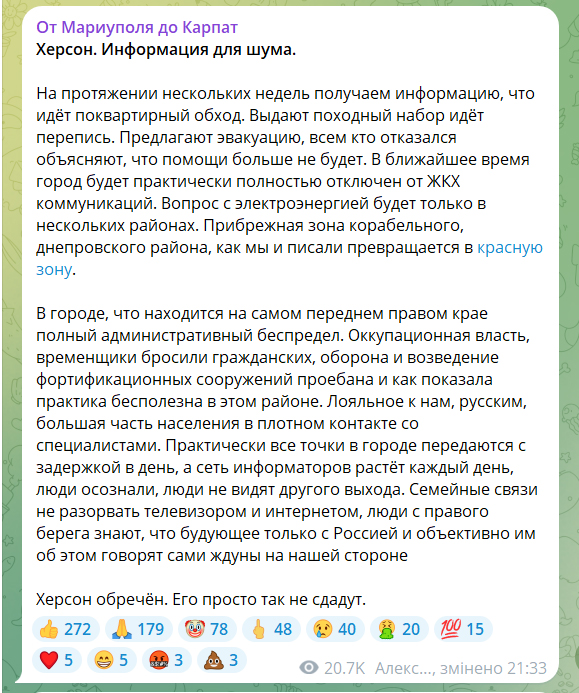 – Протягом кількох тижнів отримуємо інформацію, що йде поквартирний обхід. Видають похідний набір, іде перепис. Пропонують евакуацію, всім, хто відмовився пояснюють, що допомоги більше не буде. Найближчим часом місто буде практично повністю відключене від ЖКГ комунікацій. Питання з електроенергією буде лише у кількох районах. Прибережна зона Корабельного, Дніпровського району, як і писали, перетворюється на червону зону, – йдеться в повідомленні, розміщеному на прокремлівському Telegram-каналі «От Мариуполя до Карпат».