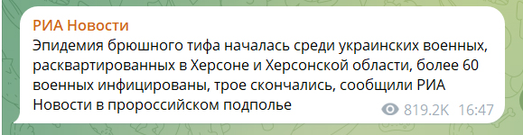 Одне з провідних російських прокремлівських видань «РИА Новости» нещодавно опублікувало новину про епідемію небезпечної інфекційної хвороби, яка начебто спалахнула серед українських військових, розміщених в Херсонській області.– Епідемія черевного тифу розпочалася серед українських військових, розміщених у Херсоні та Херсонській області, понад 60 військових інфіковано, троє померли, повідомили РИА Новости у проросійському підпіллі, – йдеться в цьому повідомленні.
