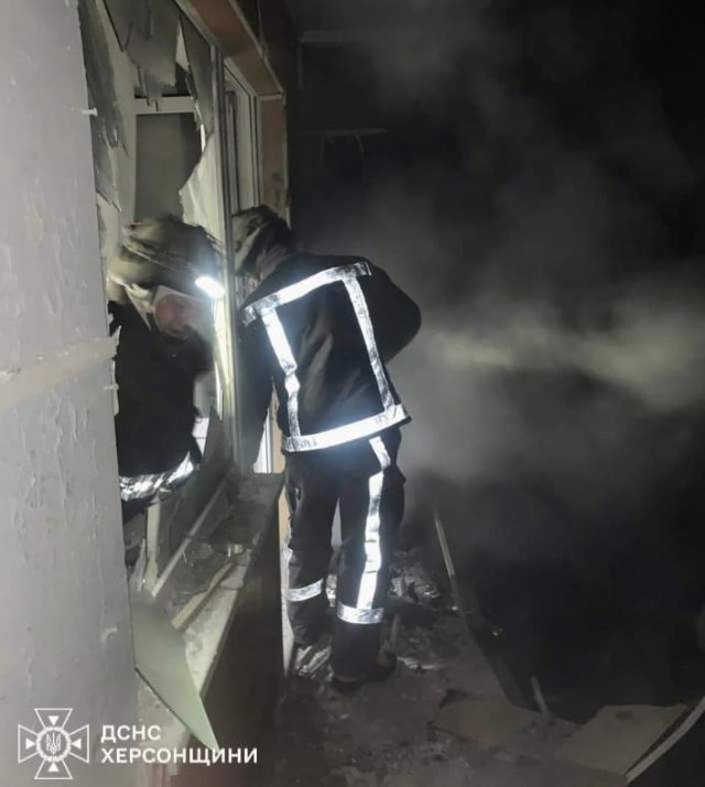 Як повідомляє Головне Управління ДСНС України у Херсонській області, ворожий снаряд влучив в багатоквартирний будинок, загорілись речі на балконі однієї з квартир.