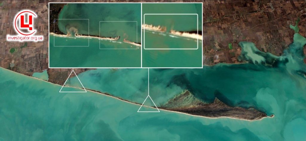 Ерозія берегової лінії о.Джарилгач після потужного шторму в листопаді. 30.11.2023 р. Фото: супутник Sentinel-2. Колаж: investigator.org.uaТаким чином, окупанти принаймні тимчасово втратили можливість дістатися до острова.