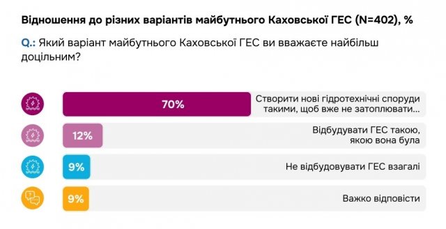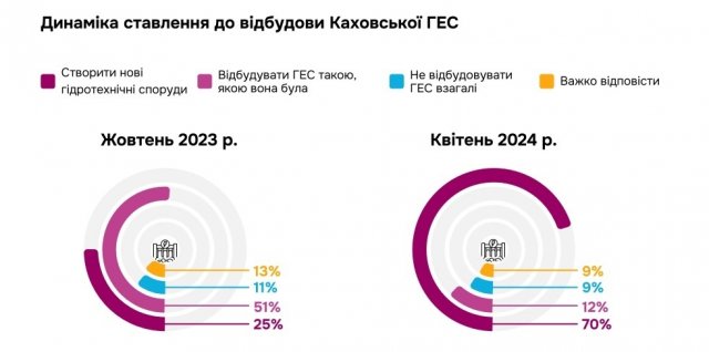 Водночас опитування зафіксувало суттєві зміни в сприйнятті херсонцями відбудови Каховської ГЕС. Якщо у жовтні 2023 року 70% опитаних виступали за те, щоб відновити її такою, як вона була, то нині понад половина херсонців хоче лише часткового відновлення дамби, щоб вода не затоплювала настільки багато територій.