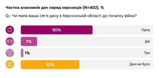 Опитування охопило 402 мешканців Херсона та області, з яких у 236 були свої дачі. Цікаво, що майже для кожного п'ятого із них дача була місцем тривалого проживання, хоча здебільшого її використовували для вирощування фруктів і овочів та відпочинку.