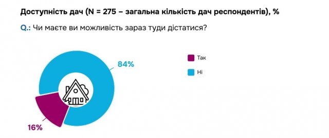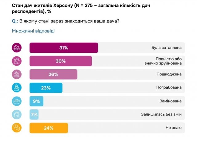 При цьому, значна частина херсонців мала дачі на лівому березі або в районах, що дуже близько прилягають до теперішньої лінії фронту. Через це руйнувань зазнали дачі 189 опитаних (68,7%), а до 231 дачі (84%) мешканці Херсонщини взагалі не можуть дістатися.