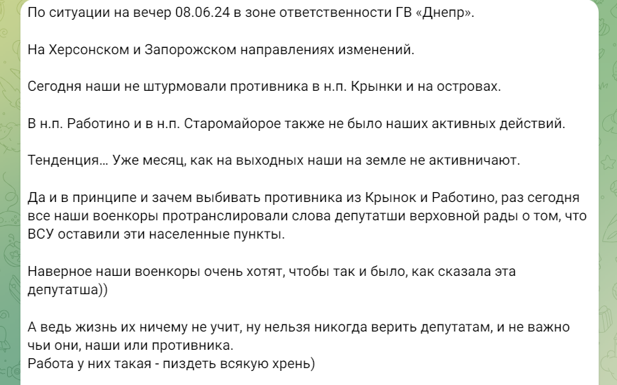 "Сегодня наши не штурмовали противника в н.п. Крынки и на островах", - повідомив адімін каналу увечері 8 червня".