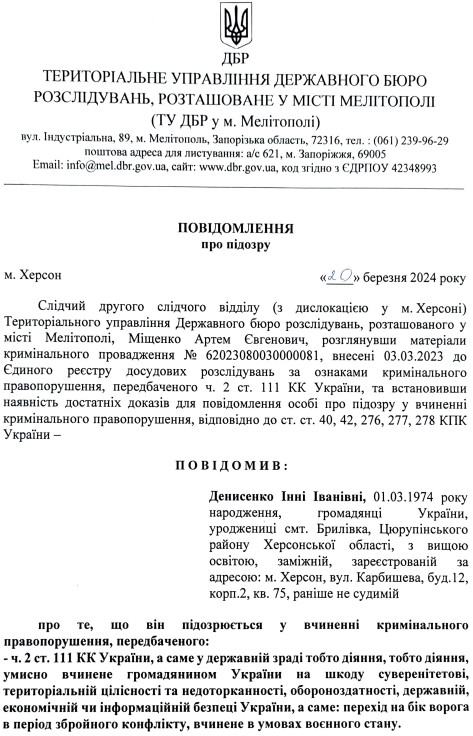 Денисенко інкримінували державну зраду, яка скоєна в умовах воєнного стану.