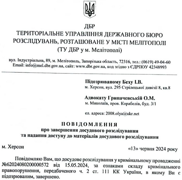 Беху інкримінували державну зраду, яка скоєна в умовах воєнного стану. До повномасштабного вторгнення Росії він працював провідним фахівцем з запобігання надзвичайних ситуацій ГУ ДСНС України в Херсонській області.