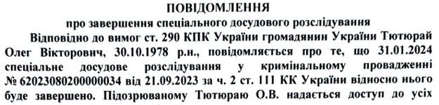 Тютюраю інкримінували державну зраду, яка скоєна в умовах воєнного стану. Він пішов на співпрацю з росіянами у травні 2022 року.