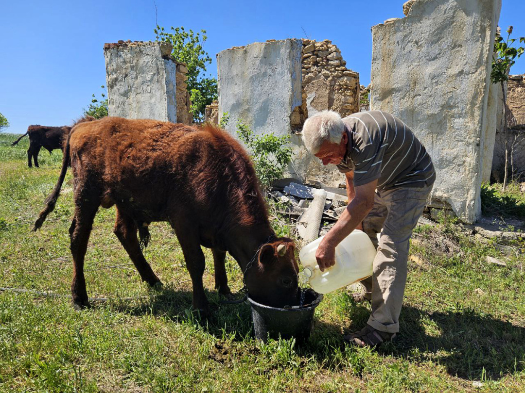Зустрічаємо на вулиці чоловіка. Знайомимося, це – пан Олександр. Ділиться, що він – на пенсії, тож хазяйнує: саме поїть бичків та теличку, має й корову, що пасеться недалеко. Його хата теж потрапила під відбудову. Пан Олександр із гордістю розповідає про сина, який служить у ЗСУ, а про реалії свого життя віджартовується.