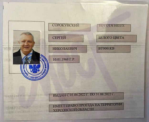 Про це свідчить фото перепустки Сорокунського від окупаційної адміністрації Херсонщини, яке МОСТ отримав від джерела в правоохоронних органах.