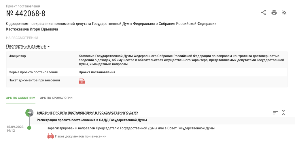На сайті Держдуми РФ опублікували проект постанови про дострокове припиненняповноважень депутатів Держдуми від фракції «Єдина Росія», в тому числі і Кастюкевича.