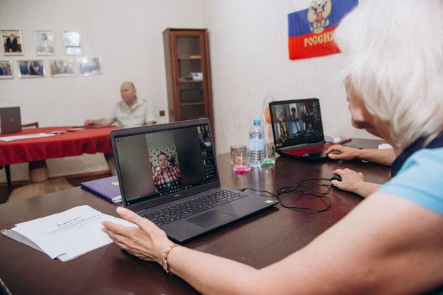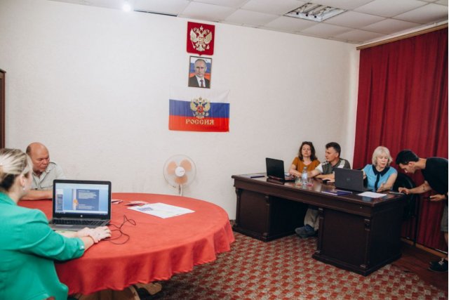 А от в окупаційному Херсонському технічному університеті фото з «захистом» «дипломів» показали. «Захист» полягав у тому, що фейкові викладачі спілкувались з фейковими студентами... в інтернеті. Але під портретом фюрера і триколором на стіні.