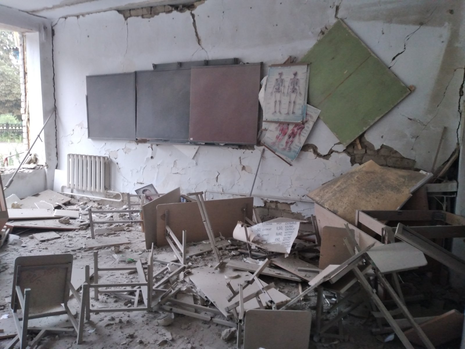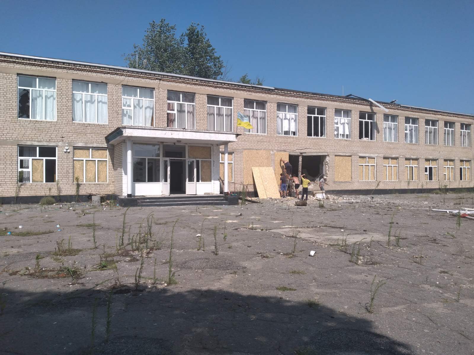 Була шоста ранку, – розповідає пані Терещенко. – З якою зброї обстріл був, не знаю. Але якась дуже потужна, бо до того таких сильних вибухів не чули. Навіть за шість кілометрів у Білозерці думали, що це не в нас, а до них прилетіло. Було п'ять обстрілів поспіль, снаряди як під лінійку “пройшлися” нашою територією. Один впав прямо під кабінетом біології. Усе всередині розтрощив, навіть перестінок вибив. Від тієї вибухової хвилі на фасаді вилетіли шибки з 66 вікон. Коли все це побачила, навіть не розуміла, як усе виправити, що там можна зробити. Особливо з тією діркою в стіні фасаду. А наші хлопці з села прибігли – хто інструмент власний несе, хто генератор, матеріали, організувалися й почали ремонтувати...