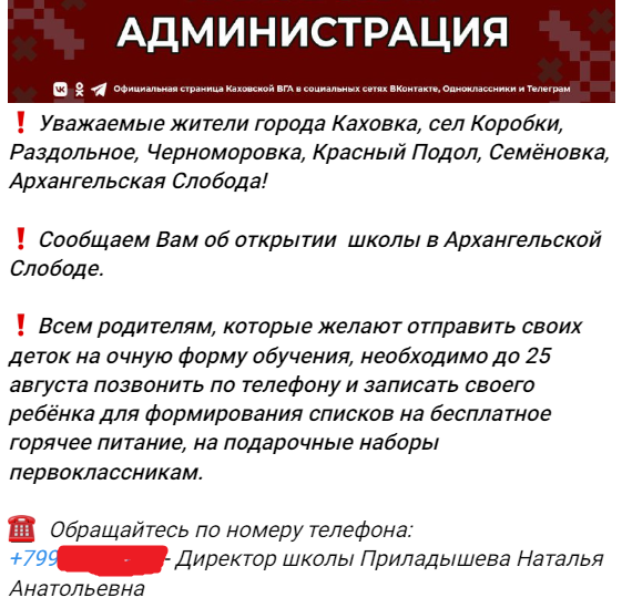 Про відкриття захопленої школи в селі Архангельська Слобода окупанти повідомили минулого тижня в своїх телеграм-каналах. На «навчання» в ній вони також запрошують дітей з Каховки, сіл Коробки, Роздольне, Чорноморівка, Червоне Поділля і Семенівка, де загарбникам не вдалося відкрити жодної школи.