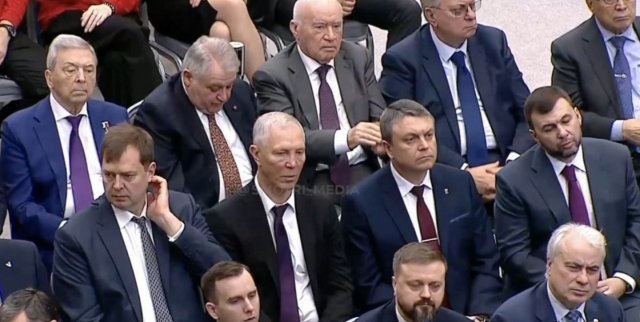 Всі четверо гауляйтерів частково окупованих областей України слухали цю маячню особисто. Камера показала їх, коли путін розповідав про штучний інтелект.