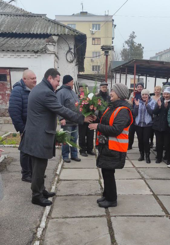 Колаборант Віталій Гура, гауляйтер Нової Каховки, вітає комунальників окупованого міста зі святом, березень 2024 року. Фото з соцмереж